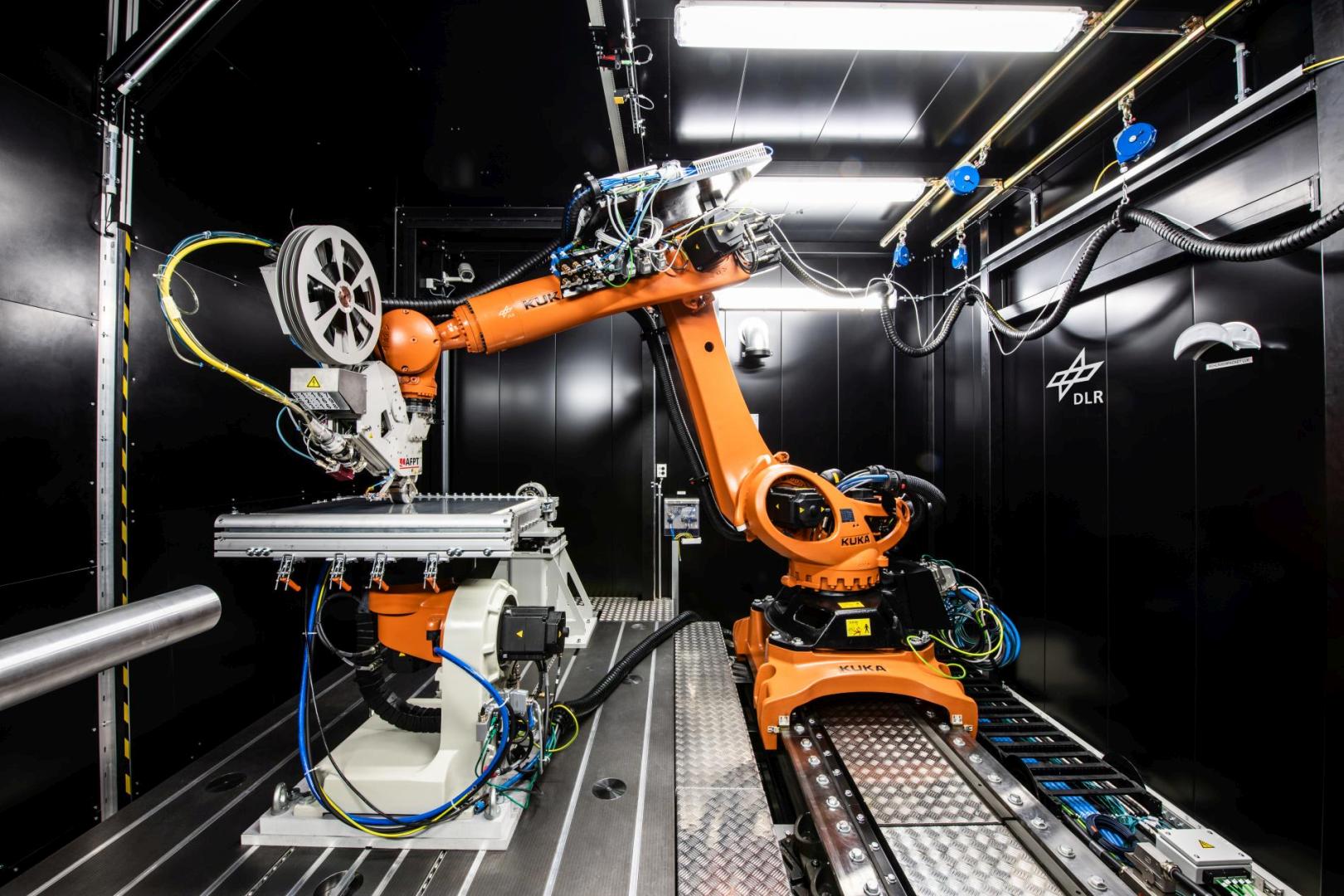 Das AFP-Verfahren ermöglicht die hochpräzise Ablage von schmalen Faserbändern (Tapes) auf gekrümmten Werkzeugoberflächen. Beim Einsatz von thermoplastischen Tapes kommt zusätzlich das sogenannte In-Situ-Konsolidieren zum Tragen: Dabei werden die Tapes während des Ablegeprozesses durch lokale Erwärmung und Druck direkt konsolidiert, sodass kein nachträglicher Schritt erforderlich ist. Dies verkürzt die Prozesskette erheblich und reduziert die Zykluszeit. Für komplexe oder großformatige Bauteile stehen dennoch Hochtemperaturpressen bereit, um zusätzliche Umformschritte oder eine finale Konsolidierung bei bis zu 450 °C durchzuführen. Die Kombination dieser Technologien erlaubt die Herstellung hochbelastbarer, endkonturnaher Strukturbauteile mit minimalem Nacharbeitsaufwand – ideal für die Luft- und Raumfahrtfertigung.