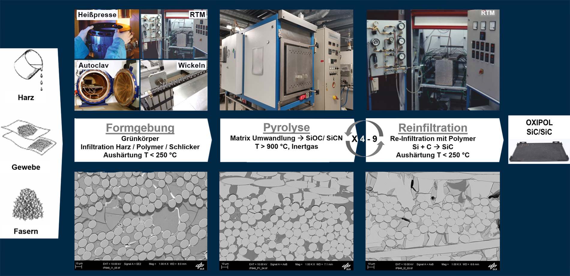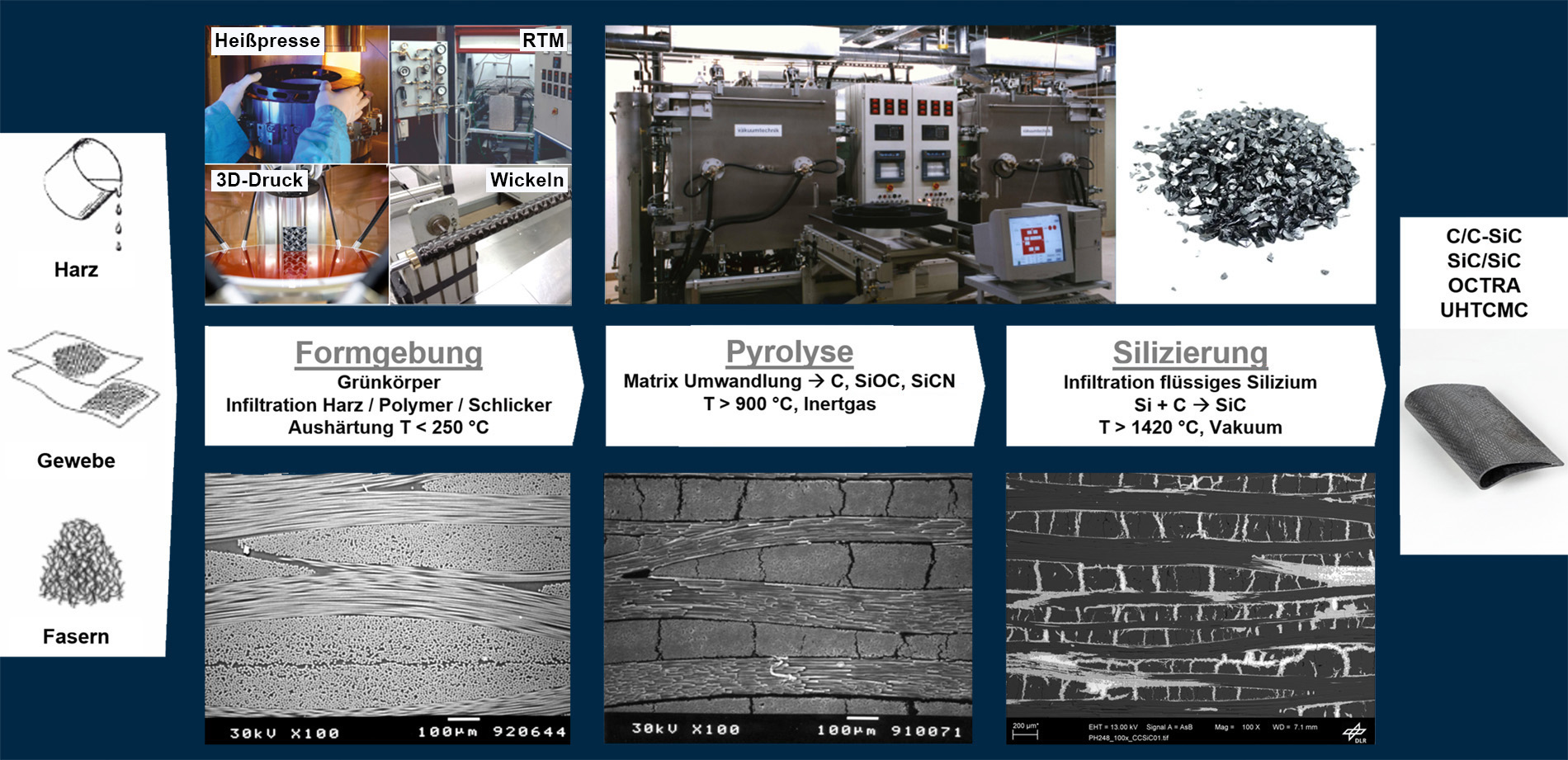 Dabei werden poröse, kohlenstoffhaltige Preformen (C/C-Vorkörper) mit flüssigem Silizium infiltriert. Das Silizium reagiert mit dem Kohlenstoff zu Siliziumcarbid (SiC) und bildet eine dichte Matrix, in der die tragenden Kohlenstofffasern eingebettet sind.